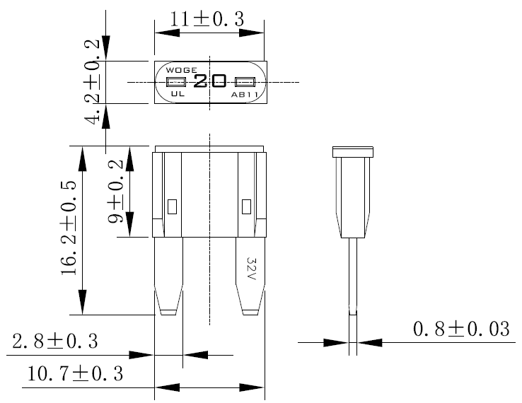 - Scope - The indicated fuse is suitable for motor vehicles, ships, and trailers. The fuse shown is used for motor vehicles, power sources, ships, and trailers to protect electrical circuits and equipment. This standard applies to the structure shown and is not intended to limit the design and use of other configurations and materials that can meet the requirements of the vehicle. 1. Scope - The fuse shown is used for protecting electrical circuits and equipment on vehicles, ships, and trailers, power sources, etc. This standard is designed for display purposes and does not restrict its use in other structures or vehicles that meet the requirements; AB11U